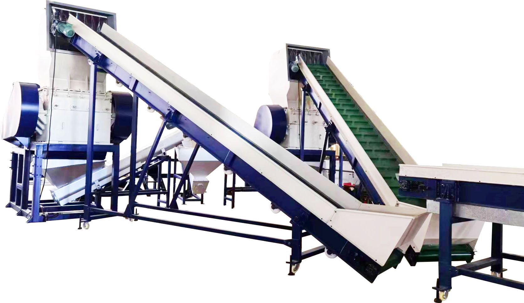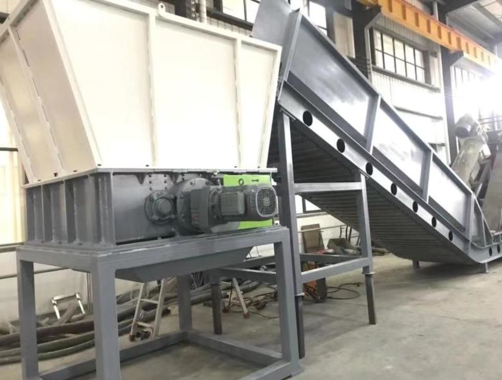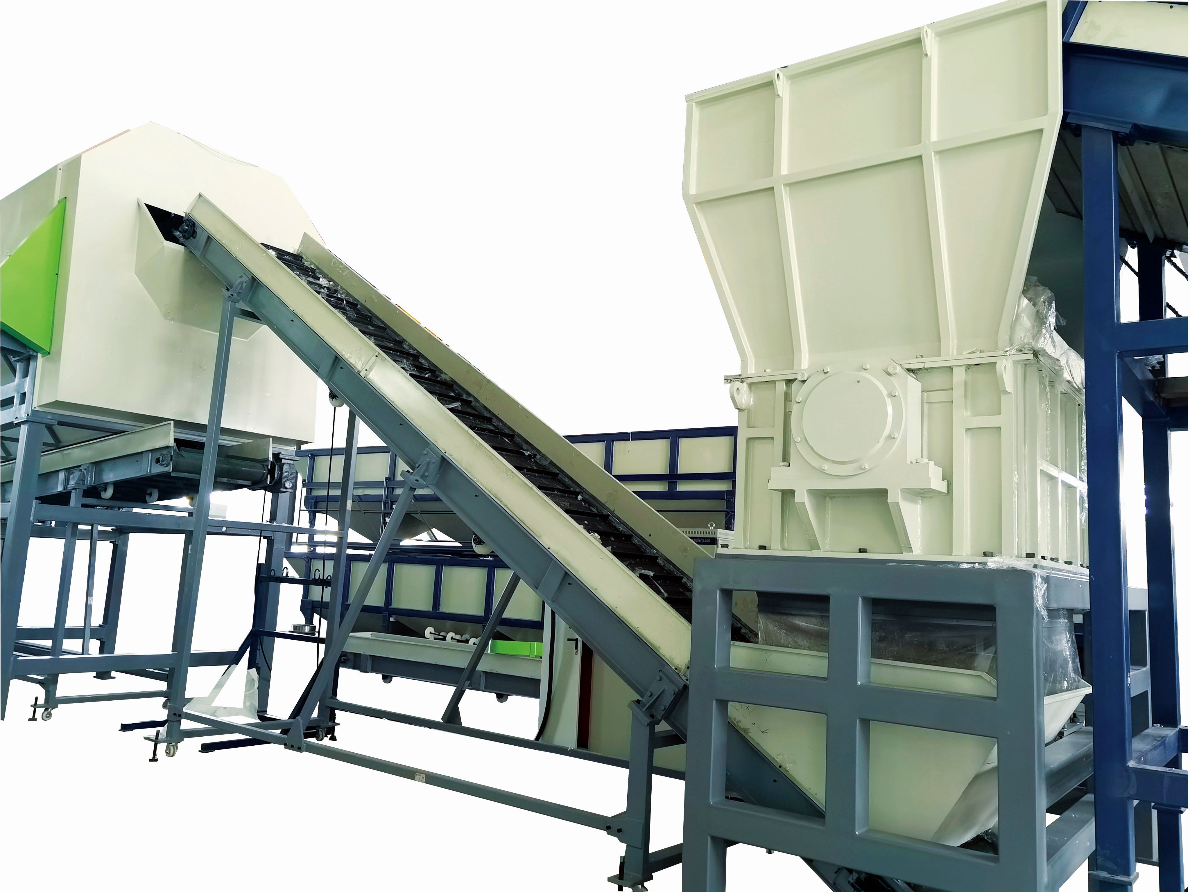 Newly design PET bottles bales opener. Four shaft effectively open the bales and convey the separated bottles into the next machines.